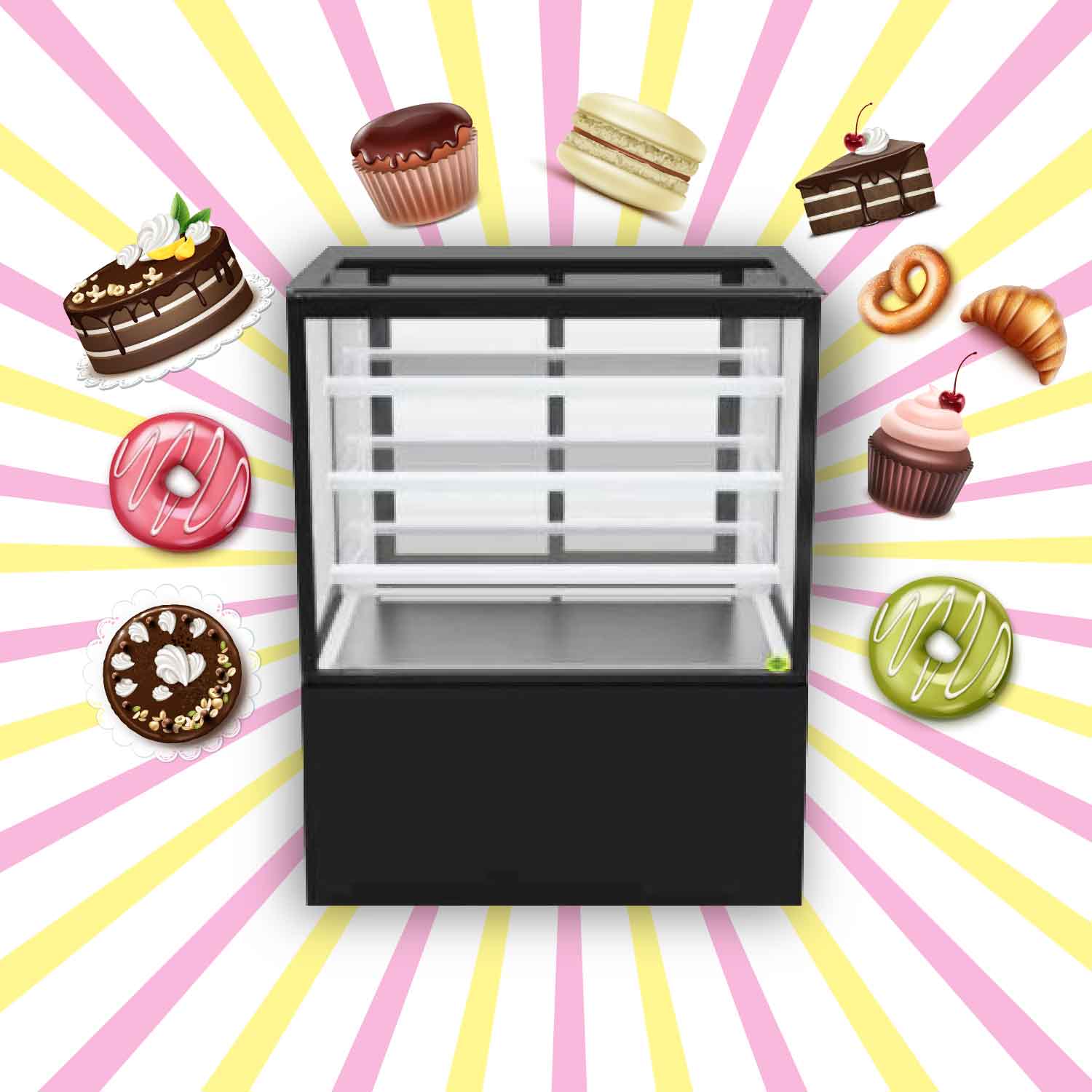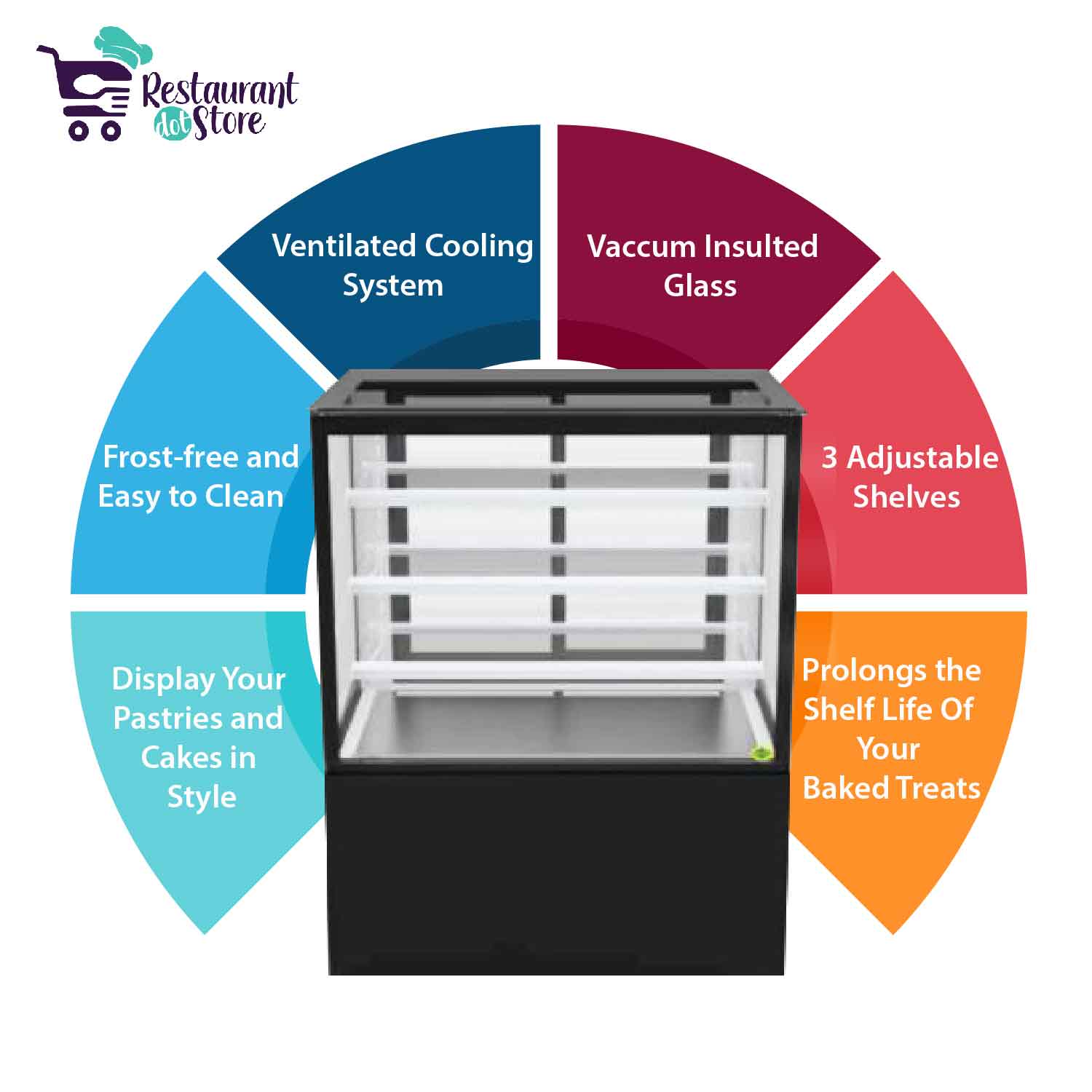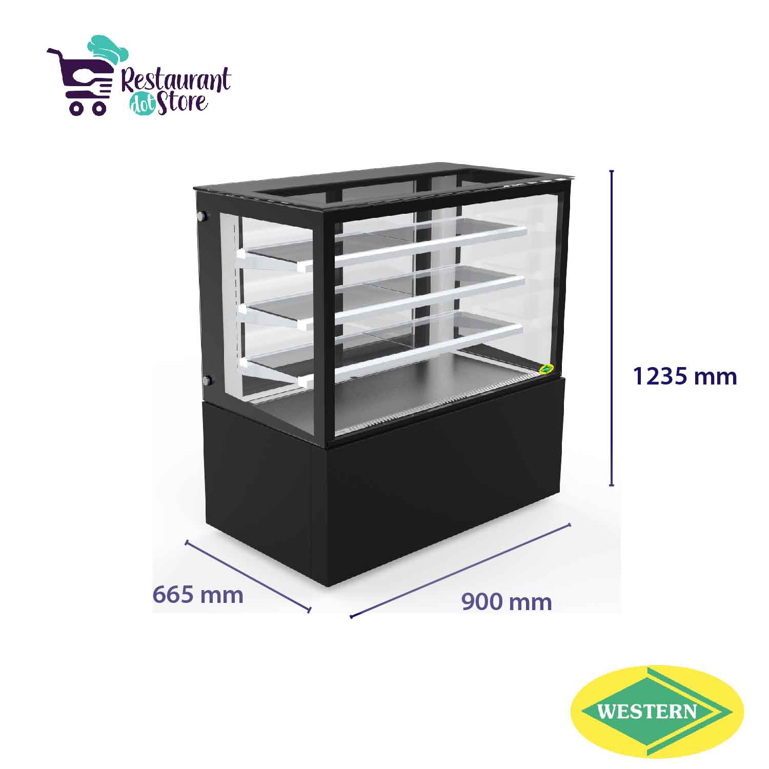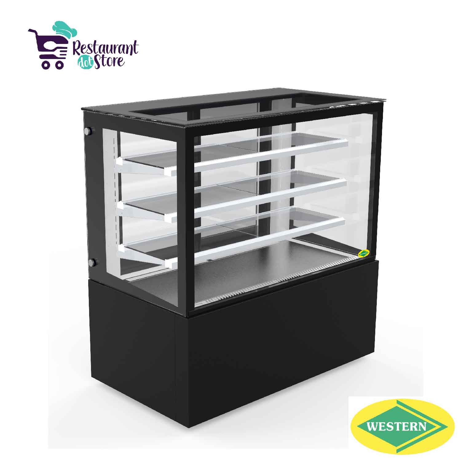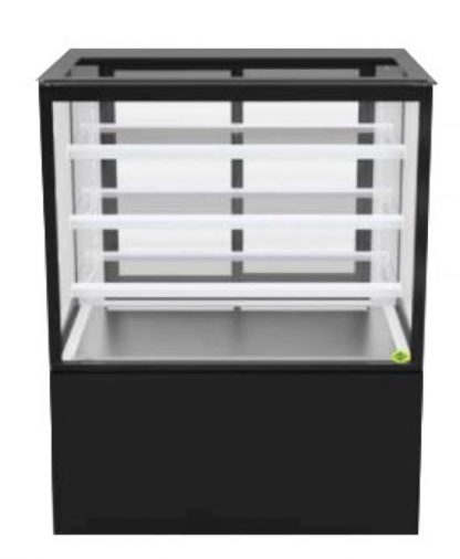 Restaurant,cafe,bakery,hotelsA 3 feet ambient cake & pastry display with powder coated sheet, vacuum insulated glass, 3 adjustable shelves, and heated glass to keep the baked items fresh