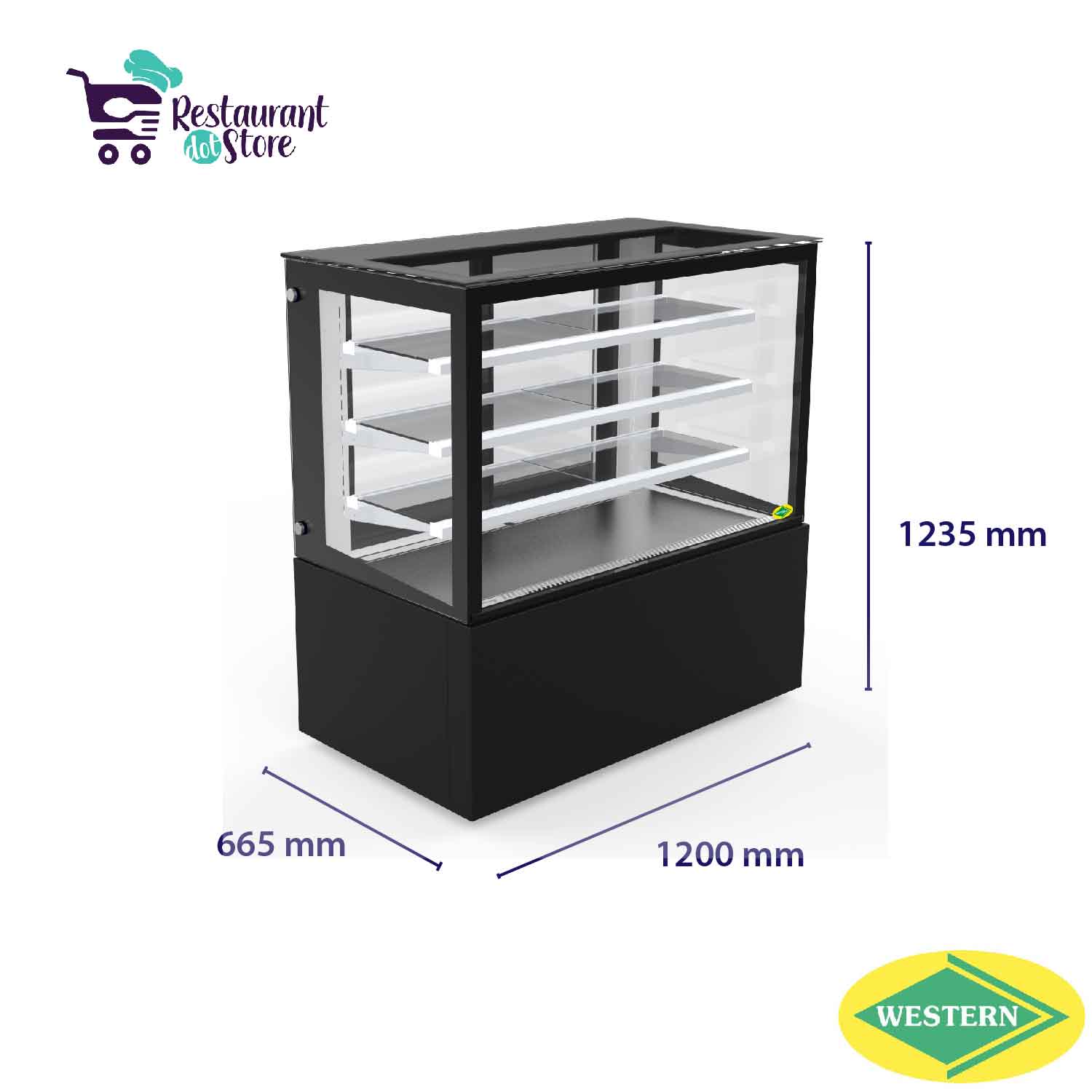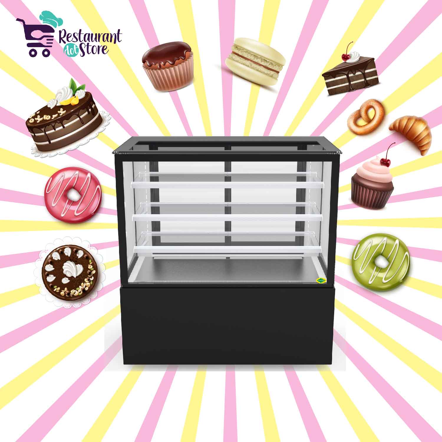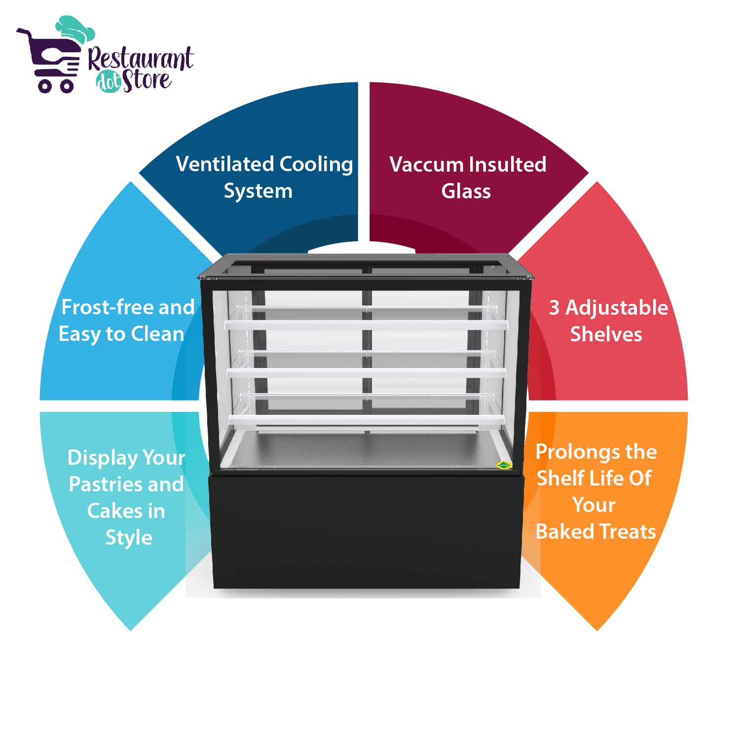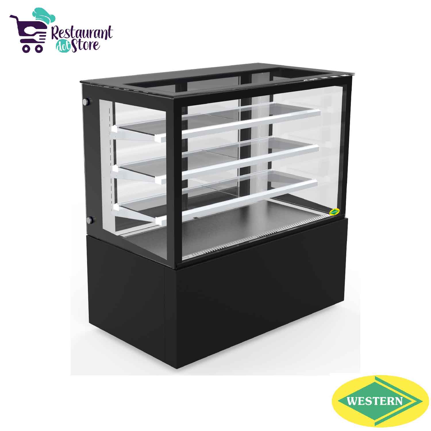 Restaurant,cafe,bakery,hotelsA 4 feet refrigerated cake pastry cabinet with powder coated sheet, vacuum insulated glass, 3 adjustable shelves, heated glass, and ventilated cooling system.