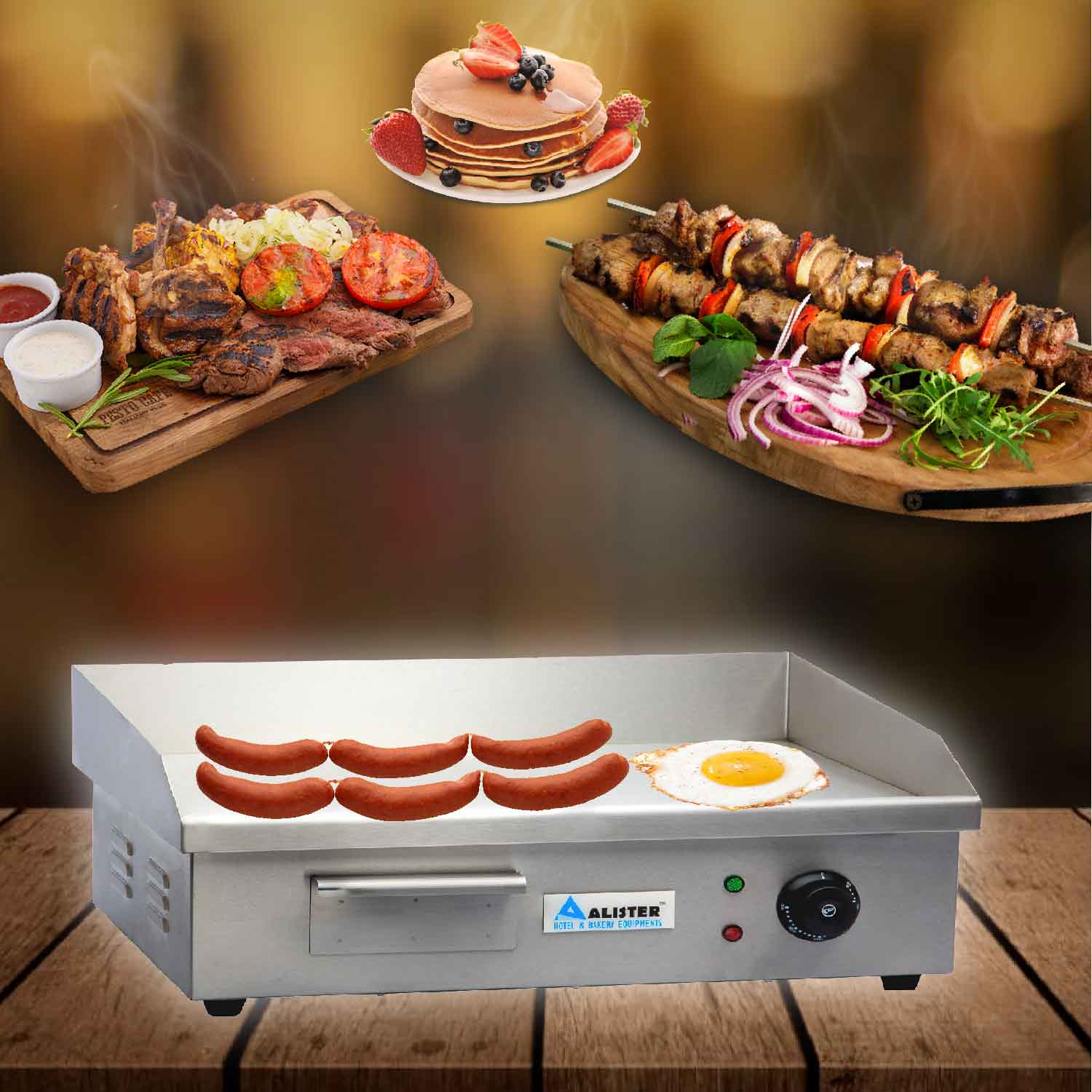 Restaurant,cafe,hotelsAn electric grill with a big griddle plate of 8mm, max temperature of 300°C, and a drip tray. Book your electric griller today