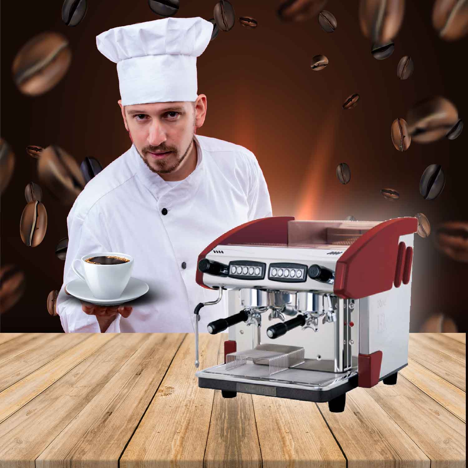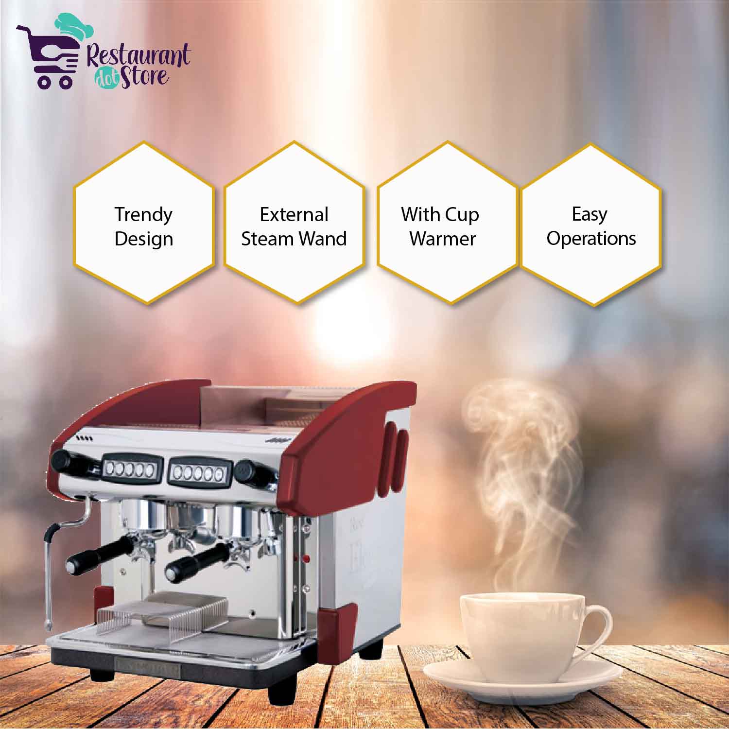 Buy a two group semi automatic electric coffee machine with 11.5 litres capacity boiler, 2 group hande, 1 steam wand, & 1 hot water dispenser.