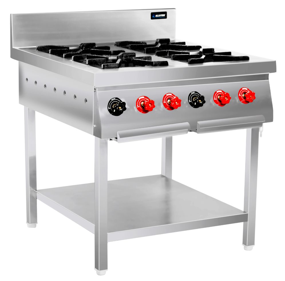 A four-burner gas+electric range with splash back, stainless steel body, 2 pilot burners, and cast iron burner. A must have equipment for your restaurant.