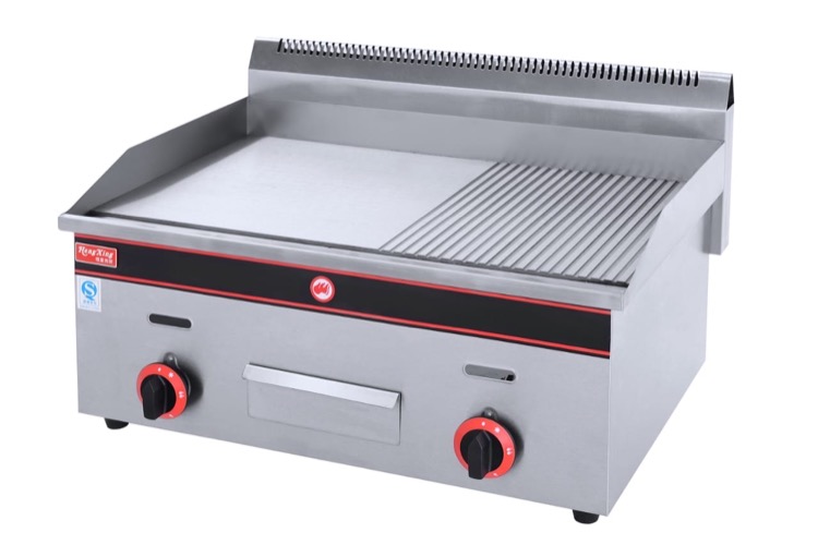 Get commercial half grooved gas griddle plate with stainless steel body, 50-300°C temperature range, 1 drip tray, & splash back
