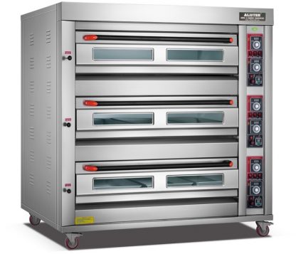 Get a three-deck, nine tray gas oven with a maximum 400°C temperature and stainless steel front and powder coated body.