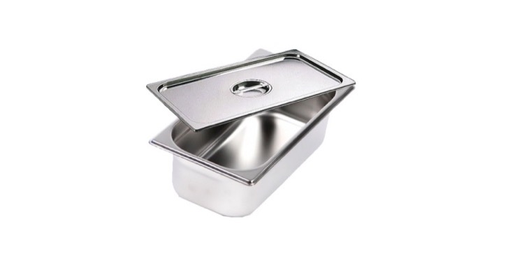 Get a commercial GN pan with stainless steel body, 1 lid, 1/3 size, width-100mm, and capacity of 3.5ltr