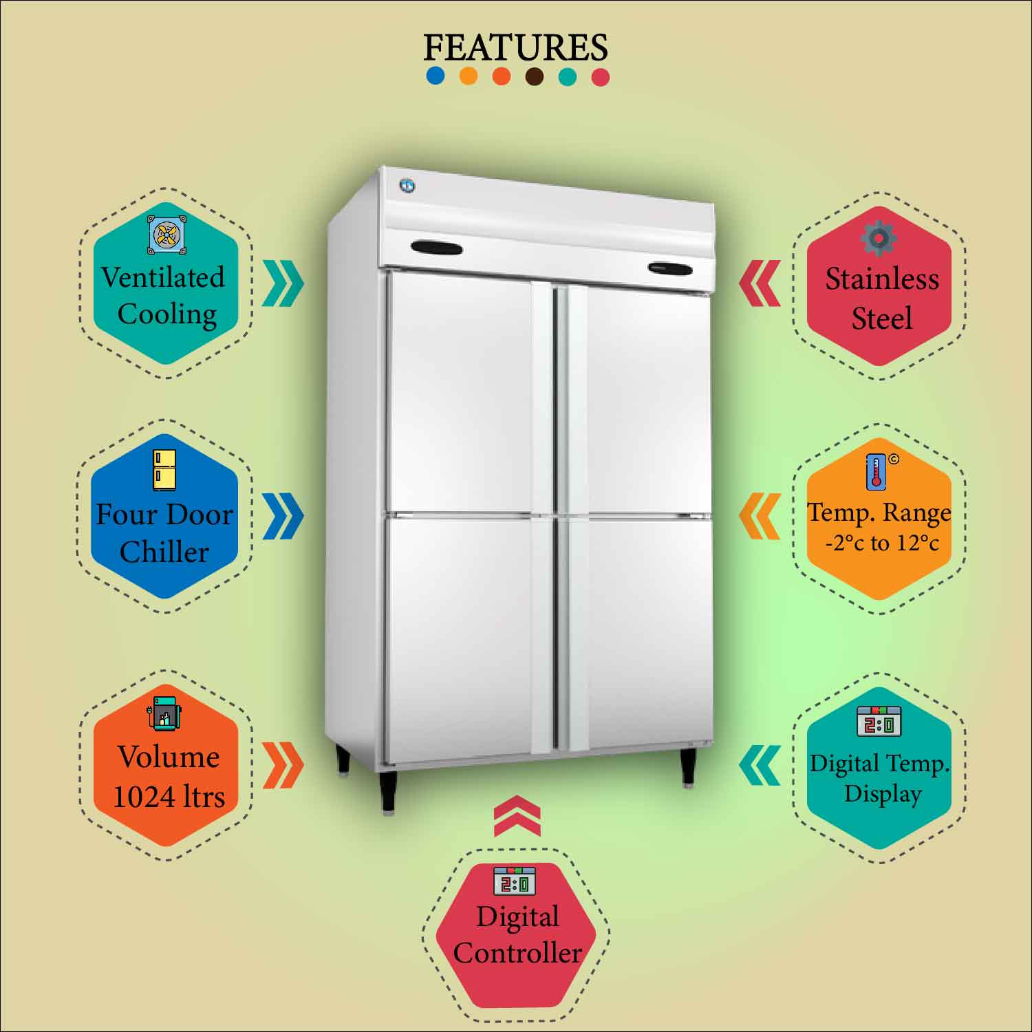 Buy our electric refrigerators with stainless steel body, 4 door vertical chiller, 1024ltr volume, digital display, and temperature range of -2° to 12°C