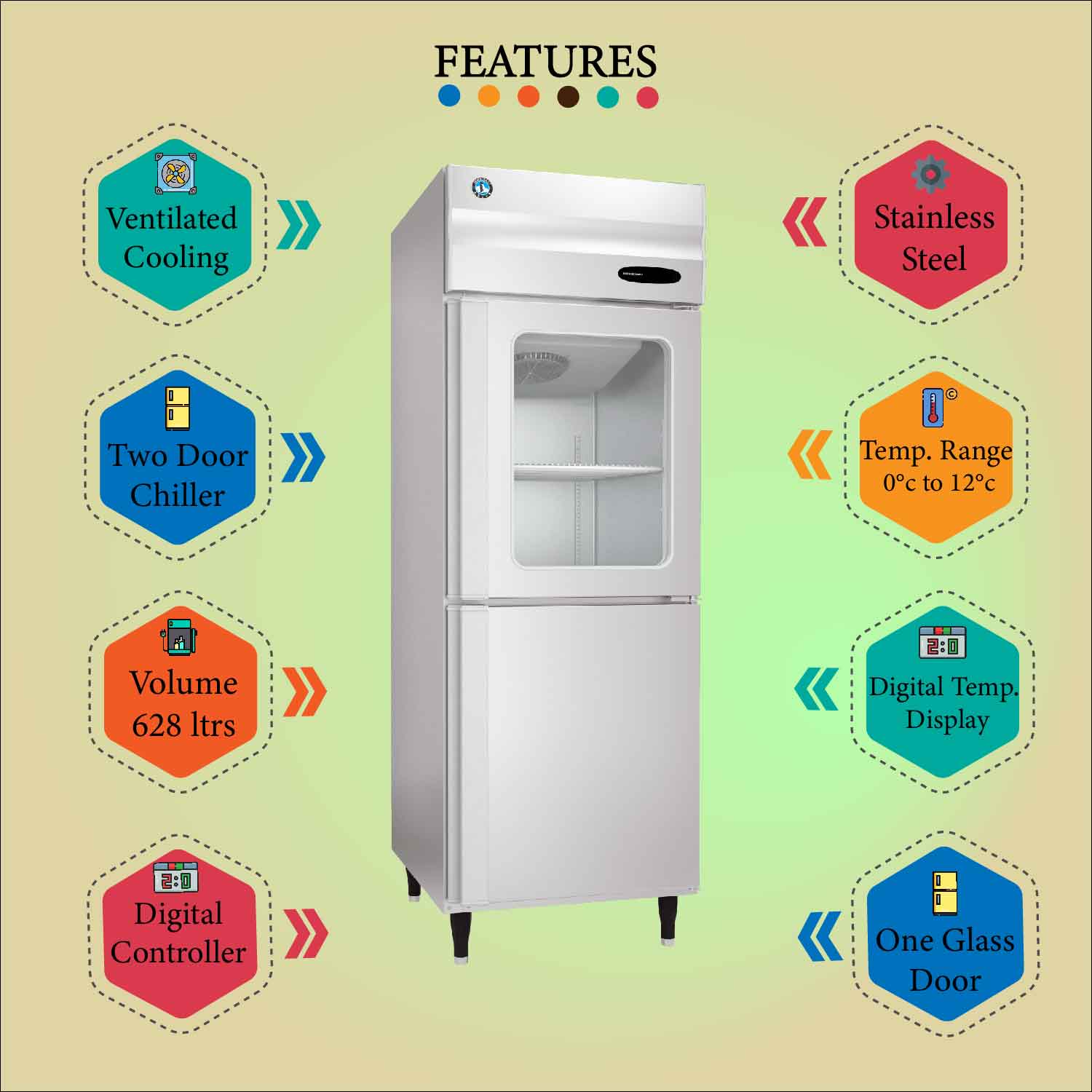 Get an electric refrigerator with SS body, 2 door vertical chiller with 1 glass door, 628ltr volume, 4 shelves, 0°C to 12°C temperature range, and a digital display.