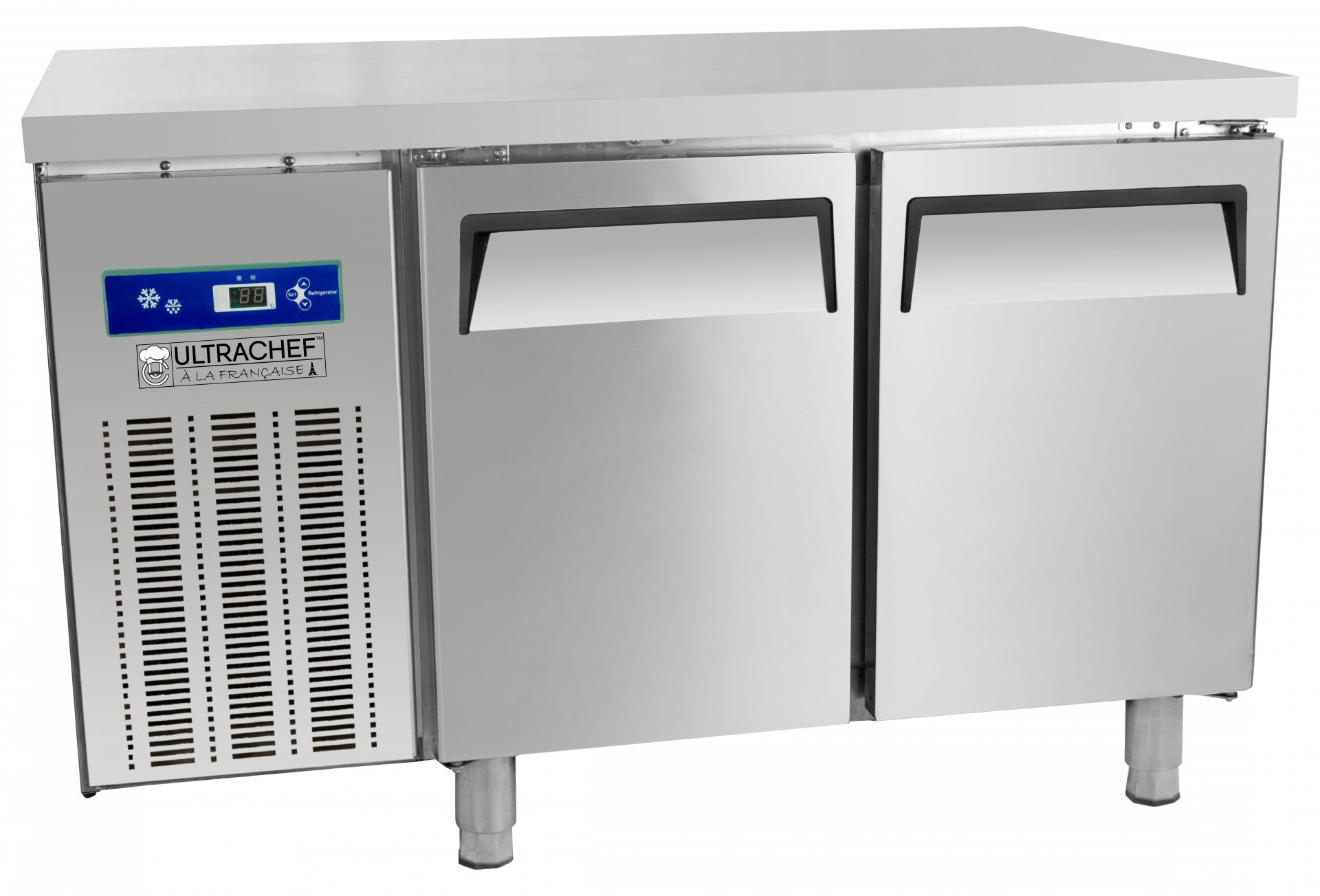 Our best quality 2 door undercounter freezer (5ftx2.5ft) with stainless steel body, 415ltr volume, -7°C to -23°C temperature range, 4 shelves, and a digital display