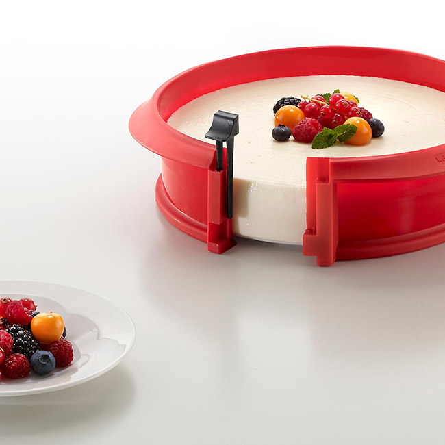 • After a hard morning’s work in the kitchen, are you frightened by the thought of taking the cake out of the mould? A whiff of defeat is already in the kitchen! We have all experienced that moment at one time or another, and we have even experienced the frustration of ruining hours of work in a matter of seconds. You will never have this problem again in your kitchen thanks to the Lékué springform mould. The mould consists of a ceramic base and a 100% platinum silicone belt that guarantees a perfect seal, preventing bothersome dripping. The ceramic base is scratch resistant so you can cut on it and its pretty design will look perfect on your table. The silicone ring is non-stick and very flexible, while also very resistant, which makes removing the mould easy, even for the most delicate desserts. It has an airtight closure system that prevents batter from spilling out, even while it is still liquid. The entire mould is suitable for use in the oven, microwave and freezer and, when you are done, just pop it into the dishwasher.
