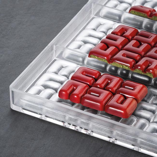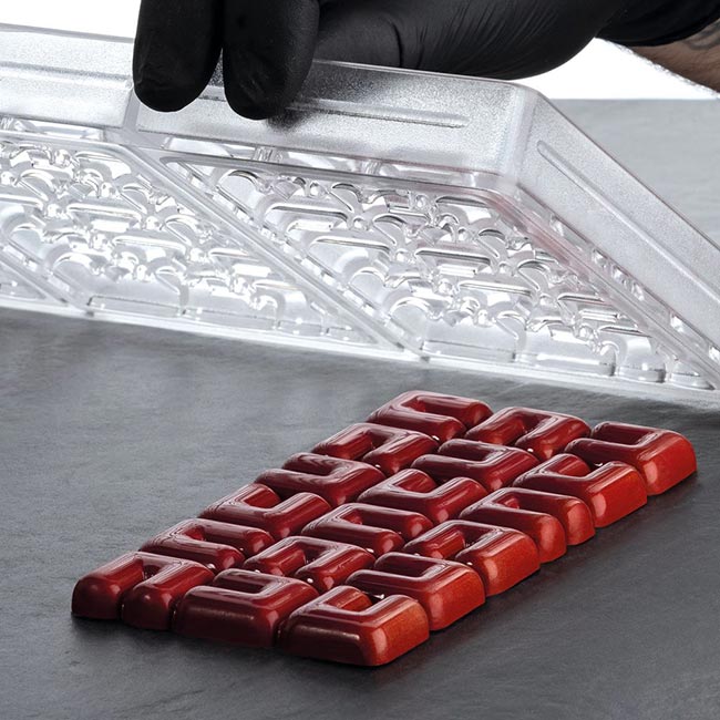 Professional mold in polycarbonate, a material that allows to obtain brilliant and perfect chocolates. It is important to sharpen the chocolate before pouring it into the mold.