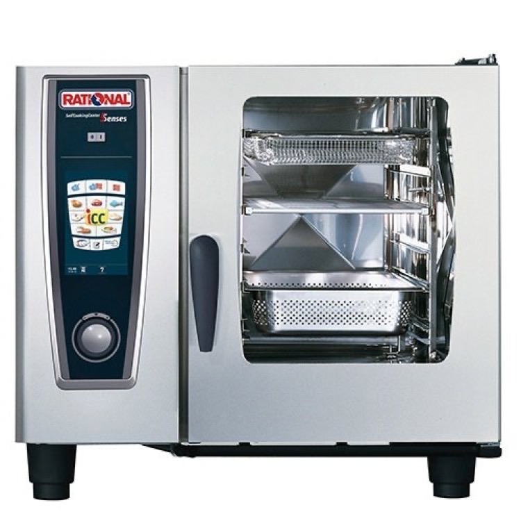 An electric commercial oven made of stainless steel with a capacity of 6 GN Pans of size 1/1, temperature range of 30 – 300°C, & 3 automatic cleaning programmes