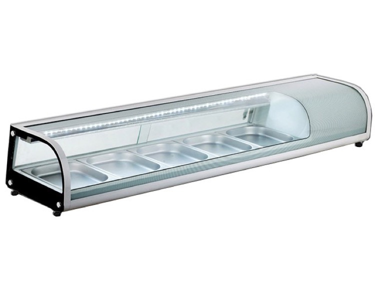 Restaurant,cafe,hotelsBuy electric commercial refrigerated Sushi display with curved glasses, volume of 52ltr, 5 GN pan of size 1/3, and with toughened glass.