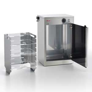 - Chamber is closed by a smoked plexiglass door. Knives holder with built in drops collecting tray. Mercury vapour lamp with wire screen protection. A safety microswitch switches the lamps on when the door is opened and switches them off when it is closed.