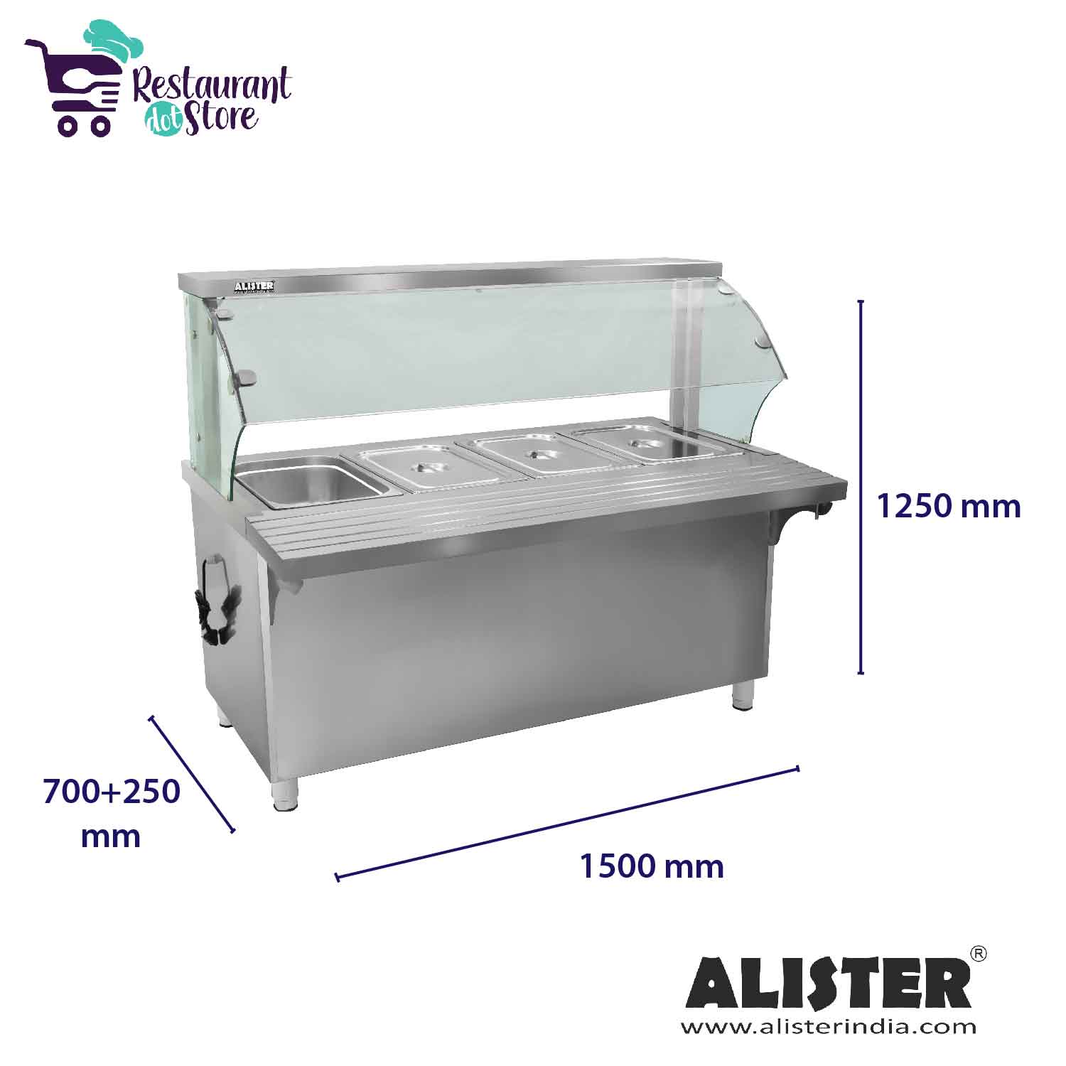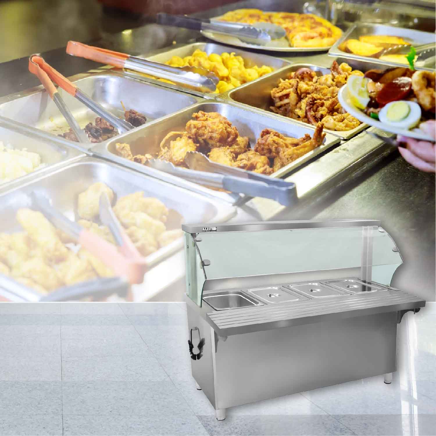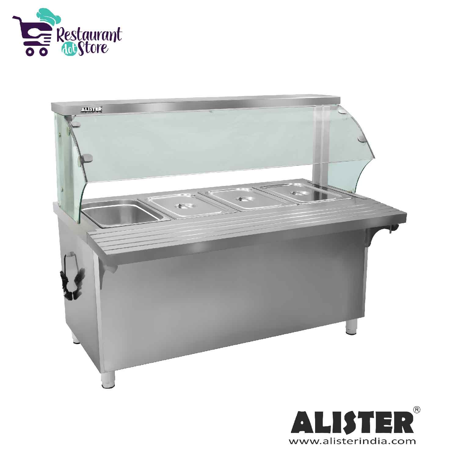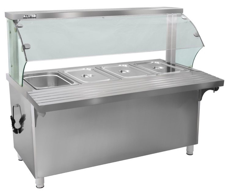 Restaurant,cafe,canteenA top-end food service Bain Marie with glass sneeze guard and 4 GN pans of 20 litres capacity each. Book your order today