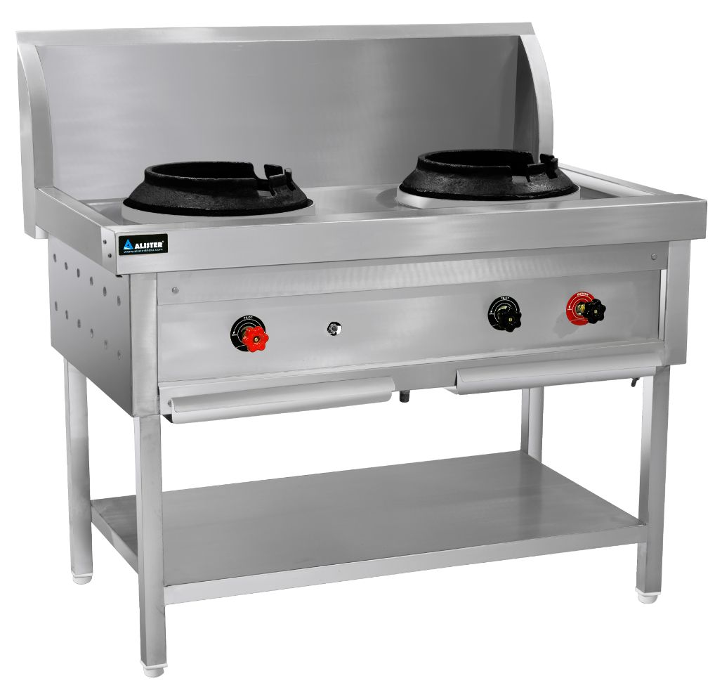 Commercial Chinese gas range with 15″ splash-back, stainless steel body, 2 burners with cast iron body, 1 under shelf, and 1 pilot burner.